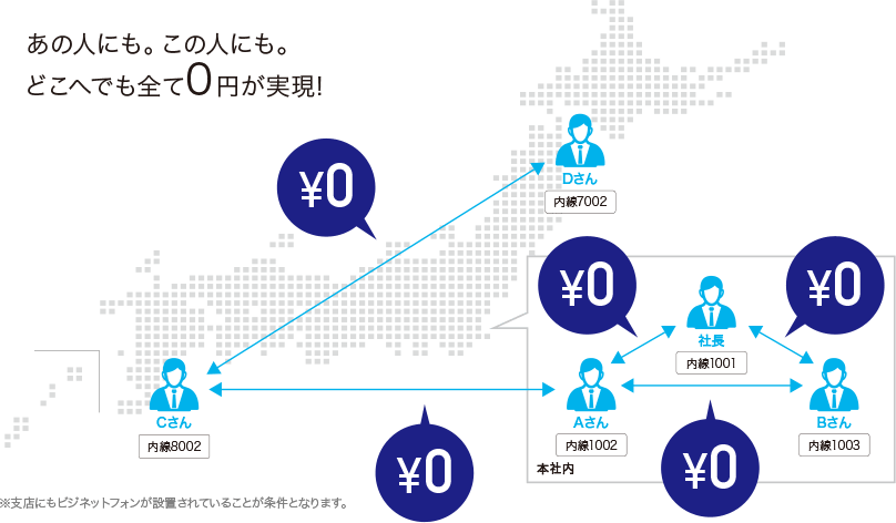 支店や店舗にそれぞれ設置した場合でも、携帯電話へアプリをインストールした場合もすべて無料で内線通話をご利用になれます。